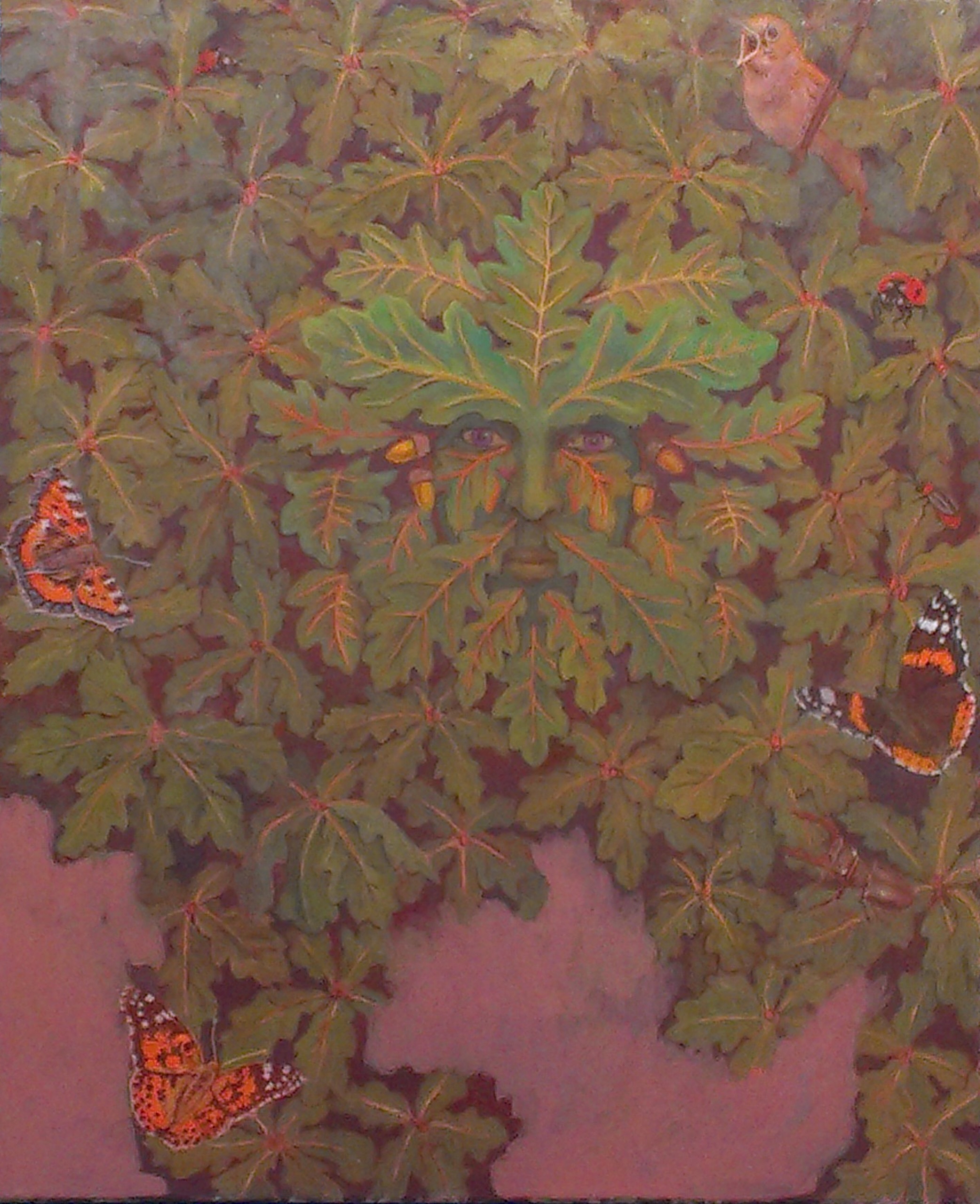 My Green Man is made of oak leaves. I looked at botanical drawings in order to construct the head. As human heads are more or less symmetrical I’ve used an arrangement of leaves that is similar on each side. Once the head was established I started to paint in more leaves using some photographs I had taken. Then I began to think of adding insects. I love painting butterflies so they were the first to go in followed by a ladybird and a stag beetle. Finally I put a nightingale into the top right corner to represent the birdsong that I associate with woodlands. When using photographic images it’s important to use an image that will work within the eye level of the picture. So you appear to be looking down at leaves and insects in the lower half of the picture and up at what is in the upper part of the painting. If possible I like to make use of the space that is outside of the picture, this is tricky to do as it involves creating a sufficient illusion of reality amongst the foliage so that the butterflies appear to float in space.
